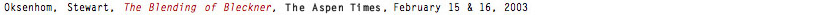 | THE BLENDING OF BLECKNER STEWART OKSENHOM Artist Moves From Abstraction to Representation and Back Again. Forces and elements that seem to be tugging from opposite ends count for much in the work of Ross Bleckner. The background of his canvases tend to be in dark shades of blues and blacks, but objects and abstract images often burst out of that darkness in brilliant light. When Bleckner is finished with one series of works, he tends to move to an opposing perspective for his next series. Throughout much of his career, there seems to have been a struggle for prominence between abstraction and representation. Specific and general, background and foreground said Bleckner, sitting in the downstairs space at Aspens Baldwin Gallery, where upstairs an exhibit of Bleckners new paintings is being readied for the next nights opening. Irony, tragedy, contradiction, discrepancy these are things I think about in my studio. Bleckners new works feature the usual dark backdrops, with faint, vague images of abstract light and shapes in the background. In the foreground are balls of bright color which Bleckner says he thinks of an interruption, an mutation. Several of the paintings also feature a blurred image of a flower. Bleckner says the flower was an image left over from previous works. The inspiration for the paintings started with an idea about humanity about anonymity, about how human personalities are in a constant state of fluctuation and blending. That idea, said Bleckner, sought an image Bleckner found that image when he came across a photograph of a common scene: a sporting event with a background of a large crowd of people. Bleckner keeps a notebook of newspaper, poster and magazine images and his own photographs, and often uses these images as a starting point for his paintings. Working from a found image, he started re-imagining that crowd shot as fuzzy paintings that bear little resemblance to the original image. Bleckner attributes the fuzzy quality of the recent pieces to sharpness of his last series, which inspired by microscopic, cellular images such as human DNA. Again, it is that sense of opposing forces playing in Bleckners mind that shows up on his canvases. The last work was precise and close-up; the new paintings are blurred and from a distance. The work before this was very sharp said the 52 year old Bleckner, whose current show his third at the Baldwin Gallery opened this week and shows through March 10. (A concurrent exhibit, Sarah Charlesworth: 0 + 1, featuring the white on white photographs by the New York artist Charlesworth, is presented in the downstairs gallery.) Prior to this, I did paintings that were very close-up, almost realistic, like using electron microscopes. There was something so specific about a DNA structure. And thats why I went back to the fuzziness. I wanted this to be the opposite. I like to make this differentiation between fuzziness and sharpness. Fuzziness or a lack of clarity, not only gives the new paintings their visual feel, but also their metaphorical content. It has to do with several things, said Bleckner. Dissolution, as in blending together, things that blend together, to make the identity of the image less decipherable. Ive always worked with that idea. Metaphorically, its the idea that our identities are always in flux, changing. And anonymity. All the molecular and DNA images were about what was going on inside the body. I wanted these paintings to be about bodies blended together. In the previous works, Its about going close up, so its like an examination; and now, its going far away, so the identity gets dispersed. What the two sets of work have in common is that tug of war between abstraction and representation that has marked Bleckners work for most of his nearly 30-year career. Whether viewed as though under a microscope or from a far distance, the actual images that form the basis of Bleckners work move away from reality and toward the abstract. When you look at something so close and so long, its abstract, he said. But some of my paintings are secret realism in that Im painting from pictures Im looking at. They really are dissolving crowds. And prior to this, they really were chains of DNA. In the realism, they make my paintings look abstract. Whats abstract and whats real? Whats abstract is real and whats real is abstract. Being Bleckner Another longstanding, primary issue in Bleckners work has been the contrast of dark and light. Whether working in seemingly abstract images, the figures of birds, flowers, and urns he has often used, or the molecular subjects, there is a literal darkness to almost all of the paintings. For the artist, there are rather simple explanations, metaphorical and technical, for all the darkness. Thats just a foil for light, said Bleckner who seems to have a causal nature. Id rather bring dark out of light than layer dark over night. Its just my optimism. Not infantile, but the childlike part of my brain that wants to make things better, make things work. Theres light at the end. A major exception to Bleckners body of work was the so-called Stripe paintings of the early to mid-1980s. All of the paintings feature thin, tight vertical lines, often in bright colors. Some of these contain Bleckners interruptions: gift bows, bisecting thick lines, birds. While the composition, technique and color are at the odds with the majority of Bleckners output, the Stripe paintings contain the signature play on perception. But instead of being fuzzy, or torn between the abstract and representational, the Stripe works create optical illusions of movement and blending. They were really about the impossibility of locating anything in particular, said Bleckner. So the opticality of them created something that was really dissolved. It was like an illuminating, a pulsation. And not being able to have one particular identity. While Bleckners paintings illustrate the shifting quality of identity, his work has been greatly influ
